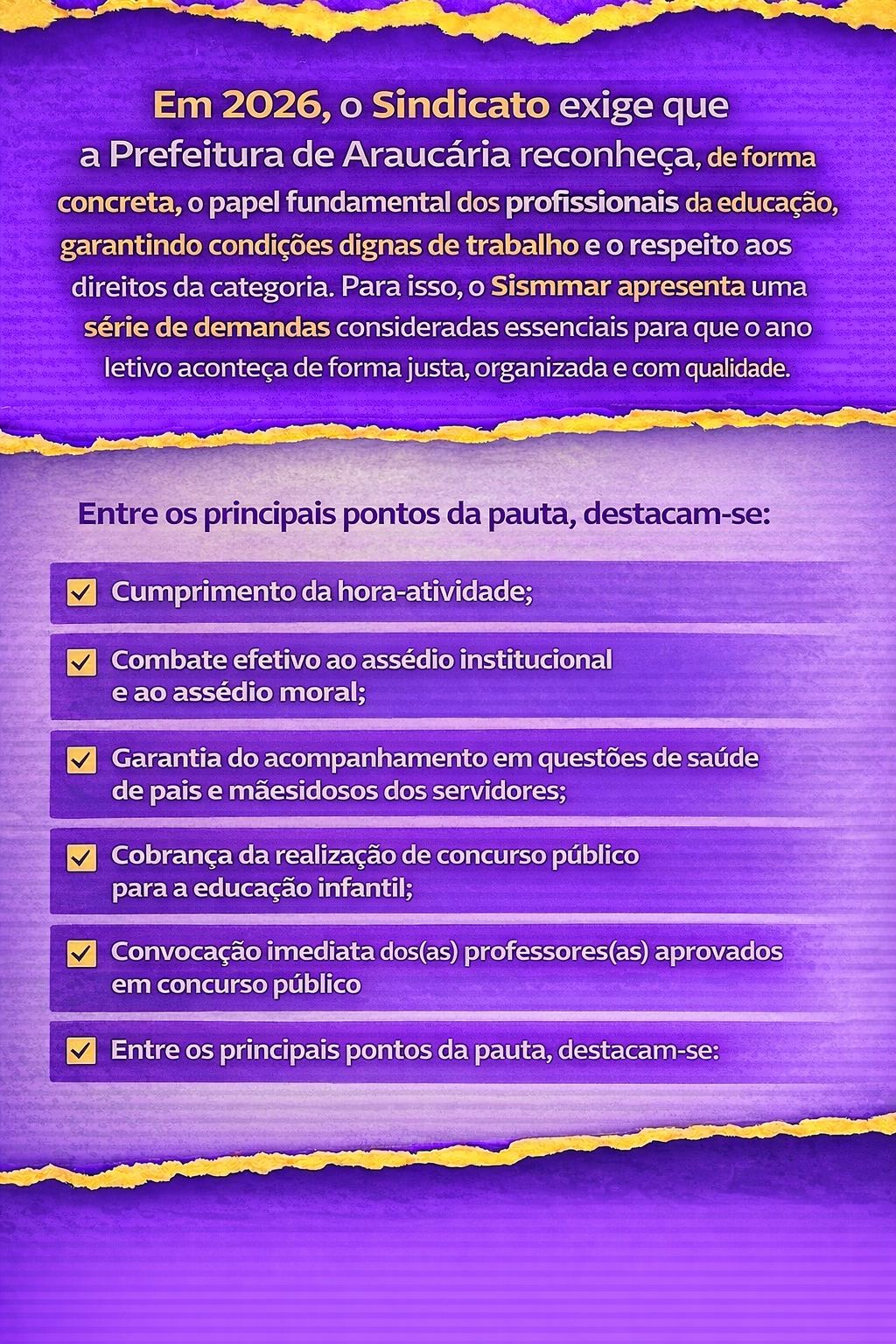 🏛️ Em 2026, o Sindicato exige que a Prefeitura de Araucária reconheça, de forma concreta, o papel fundamental dos profissionais da educação, garantindo condições dignas de trabalho e o respeito aos direitos da categoria. Para isso, o Sismmar apresenta uma série de demandas consideradas essenciais para que o ano letivo aconteça de forma justa, organizada e com qualidade.