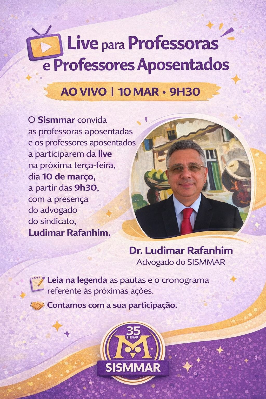 📢 O Sismmar convida as professoras aposentadas e os professores aposentados a participarem da live na próxima terça-feira, dia 10 de março, a partir das 9h30, com a presença do advogado do sindicato, Ludimar Rafanhim.