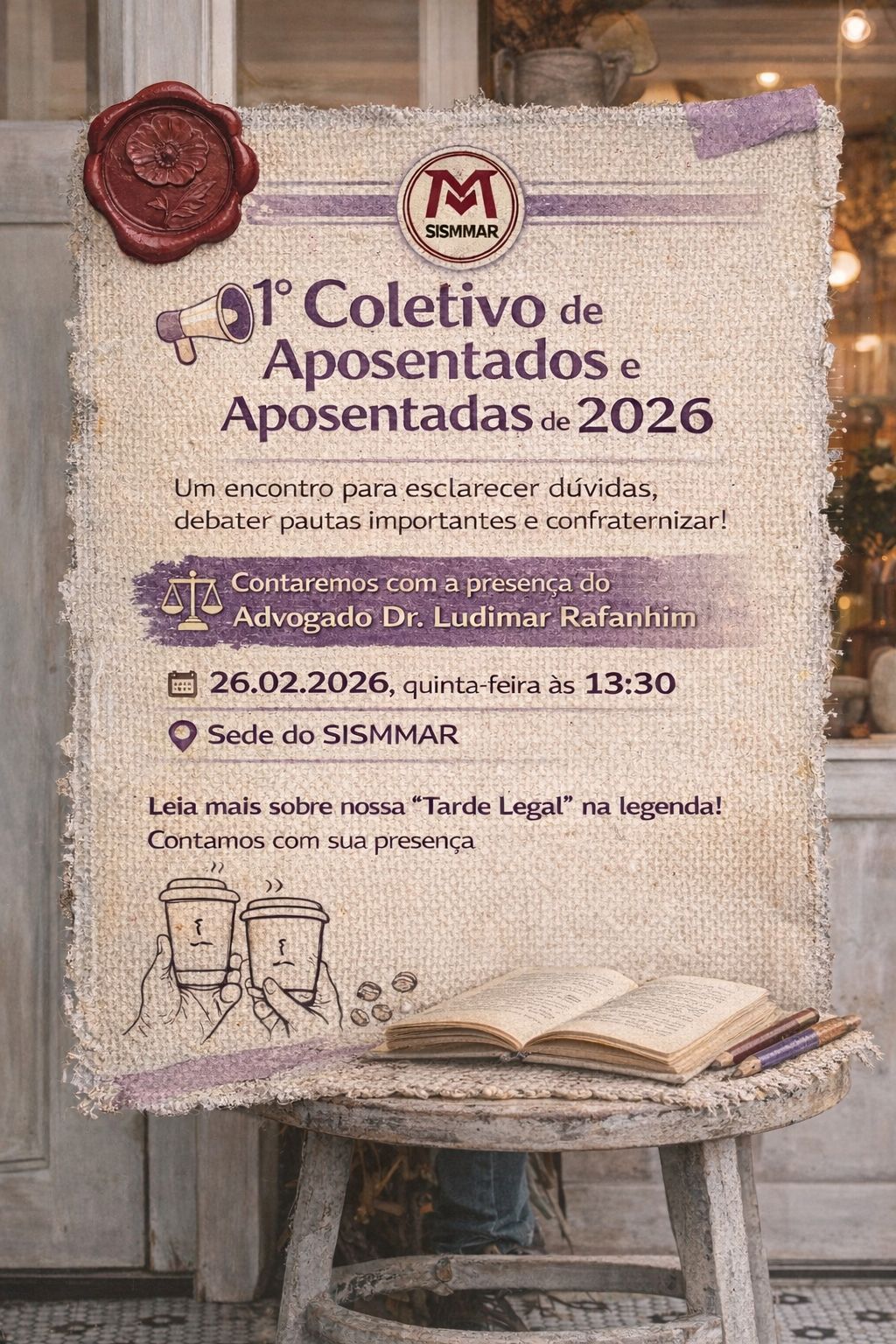 Na próxima quinta-feira, 26/02, às 13h30, será realizado o 1º Coletivo de Aposentadas e Aposentados de 2026, em uma programação especial intitulada “Uma tarde legal”.