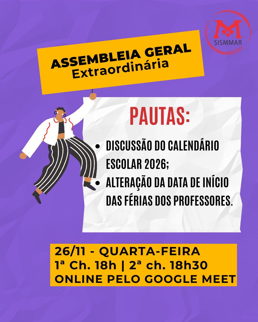 📍O SISMMAR convoca todos os professores para participarem da Assembleia Geral Extraordinária, que será realizada online no dia 26 de novembro, com primeira chamada às