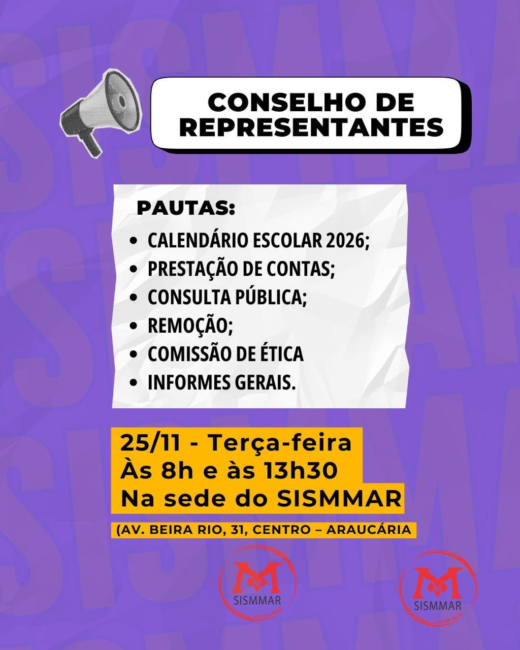 🛑 Reforçamos o convite a todas e todos os representantes para participarem amanhã, dia 25 de novembro, do *Conselho de Representantes, que ocorrerá em dois