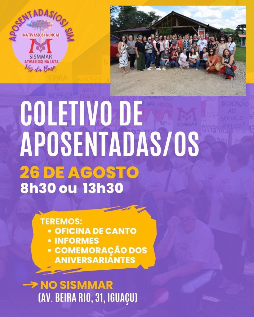 😃 QUERIDAS(OS) APOSENTADAS E APOSENTADOS!!! 📍Dia 26/08 (terça-feira) às 8h30min ou às 13h30min, teremos o nosso Coletivo de Aposentadas e Aposentados, no SISMMAR. 🎤 Nesse dia, estaremos realizando a OFICINA DE CANTO CORAL, com o cantor Yago Strugulski e a pianista Nancy Suguimati. Venha participar dessa experiência única e especial!!! 🥰 📌 Também teremos a […]