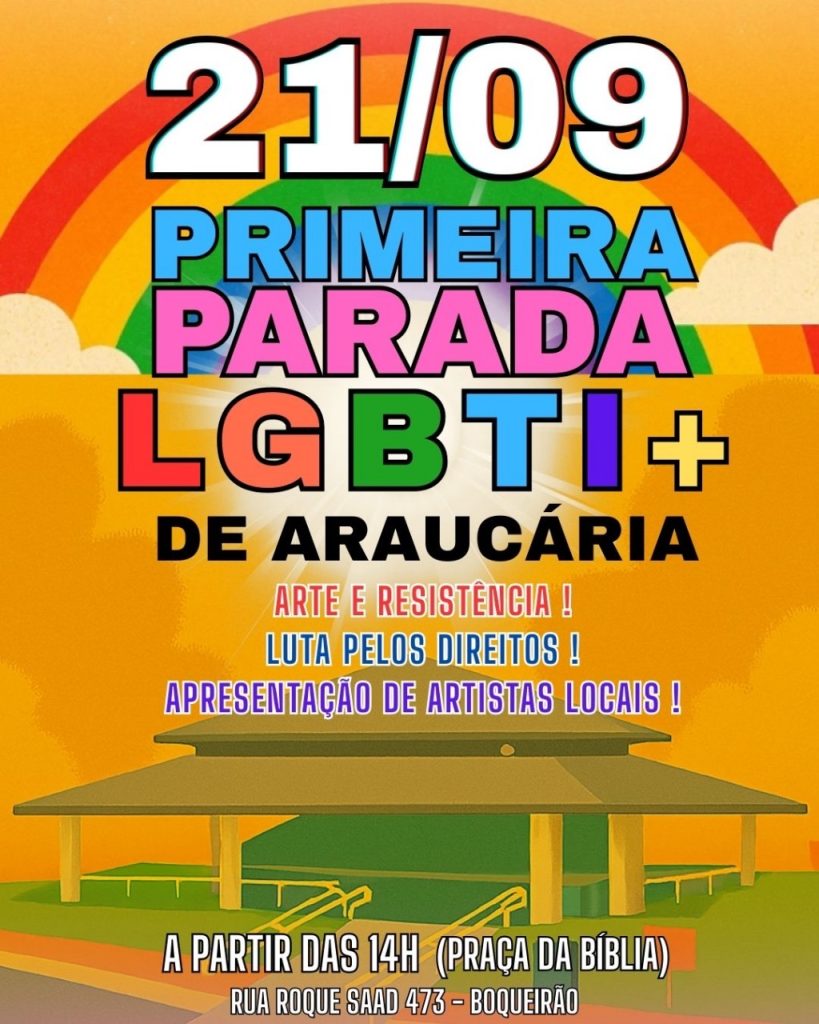 🌈✨ Primeira Parada LGBTI+ de Araucária ✨🌈 Amanhã, 21 de setembro, Araucária vai brilhar de orgulho! A partir das 14h, nos encontramos na Praça da Bíblia (Rua Roque Saad, 473 – Boqueirão / Fazenda Velha) para um dia de resistência, visibilidade e muita arte. 🎨 📍Serão apresentações de artistas locais, com muita energia positiva e […]