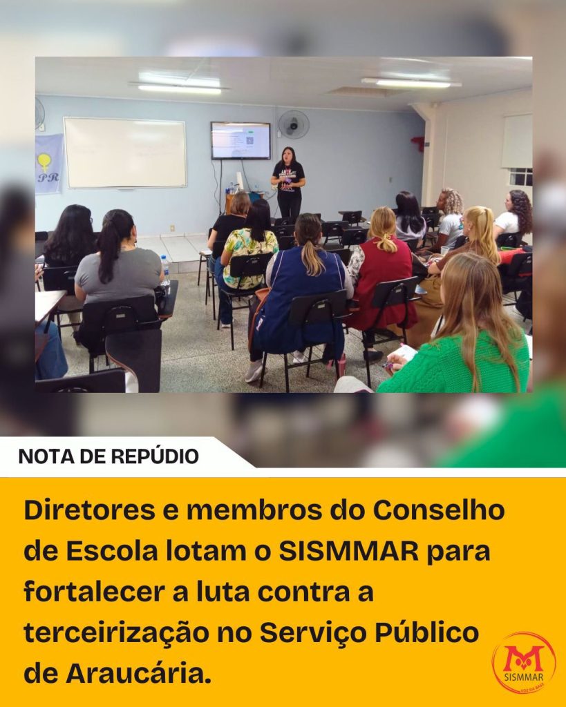 O Sindicato dos Servidores do Magistério Municipal de Araucária (SISMMAR) vem a público manifestar repúdio à publicação realizada pela Secretária Municipal de Educação, Tatiana Assuiti, em suas redes sociais, onde expôs de forma inadequada uma turma específica da rede pública de ensino. Entendemos que a exposição de estudantes e unidades escolares em espaços públicos, atribuindo-lhes […]