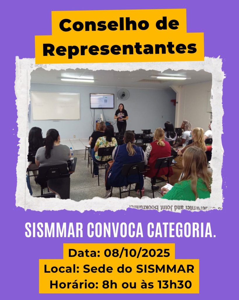 O SISMMAR convoca os(as) Representantes das Unidades Educacionais para a reunião do Conselho de Representantes. ✊📚 📅 Data: 08/10/2025 (quarta-feira) 🕗 Horários: Manhã – 8h | Tarde – 13h30 📍 Local: SISMMAR (Av. Beira-rio, 31 – Araucária) ➡️ Pautas: •Terceirização (edital 03/2025) •Equiparação salarial / Substituição •Processo de remoção •Projeto de Lei da Jornada Suplementar […]