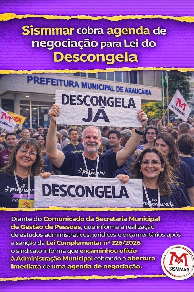 Diante do comunicado da 🏛️ Secretaria Municipal de Gestão de Pessoas, que informa a realização de estudos administrativos, jurídicos ⚖️ e orçamentários 💰 após a sanção da Lei Complementar nº 226/2026, o sindicato informa que encaminhou ofício à Administração Municipal cobrando a abertura imediata de uma agenda de negociação 📝🤝. A Lei Complementar nº 226/2026 […]