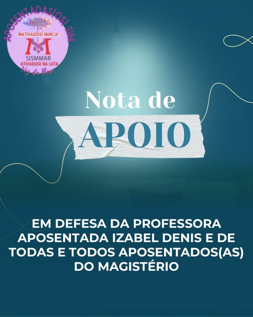 O Coletivo de Aposentadas e Aposentados do SISMMAR vem a público manifestar seu apoio irrestrito à professora aposentada Izabel Denis, sindicalizada, que, durante a Assembleia da Comissão de Ética, ao exercer legitimamente o direito à palavra, foi desacatada e desrespeitada. O ocorrido configura uma grave manifestação de etarismo associada à misoginia, ao tentar silenciar, desautorizar […]