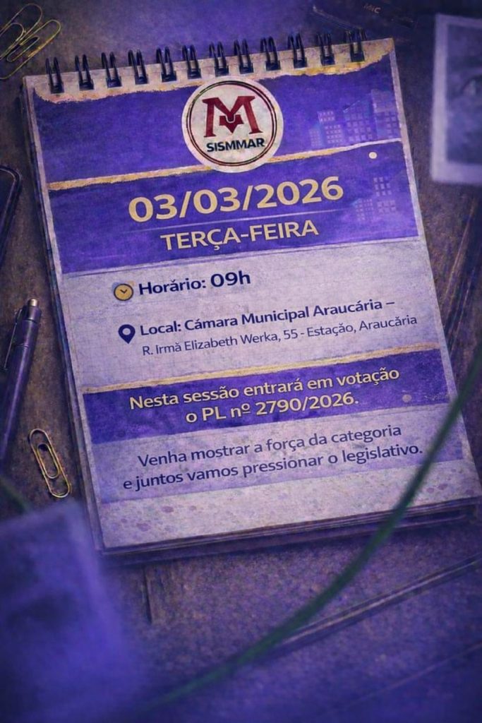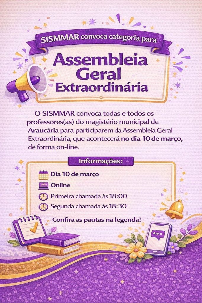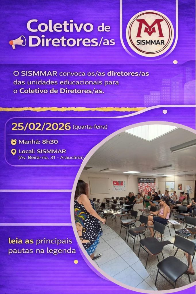O SISMMAR, Sindicato dos Servidores do Magistério Municipal de Araucária, vem por meio deste convocar os/as diretores/as das unidades educacionais para o Coletivo de Diretores/as. 📅 Dia: 25/02/2026 (quarta-feira) 🕣 Horário: Manhã – 8h30 📍 Local: SISMMAR (Av. Beira-rio, 31 – Araucária) 📌 Pautas: * 🏫 Organização das unidades 2026: condições de trabalho e alimentação […]
