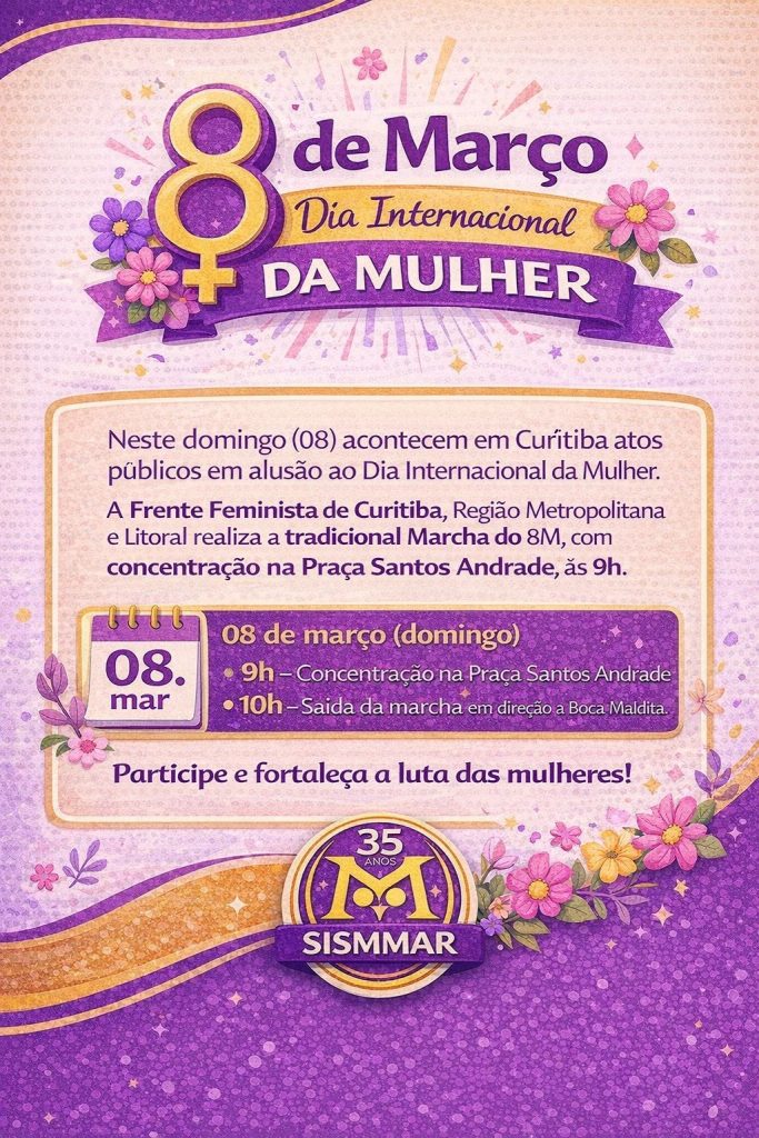Neste domingo (08) acontecem em Curitiba atos públicos em alusão ao Dia Internacional da Mulher. A Frente Feminista de Curitiba, Região Metropolitana e Litoral realiza a tradicional Marcha do 8M, com concentração na Praça Santos Andrade, às 9h. 📍 Com o tema “Pela vida das mulheres, contra o imperialismo, por democracia, soberania e pelo fim […]