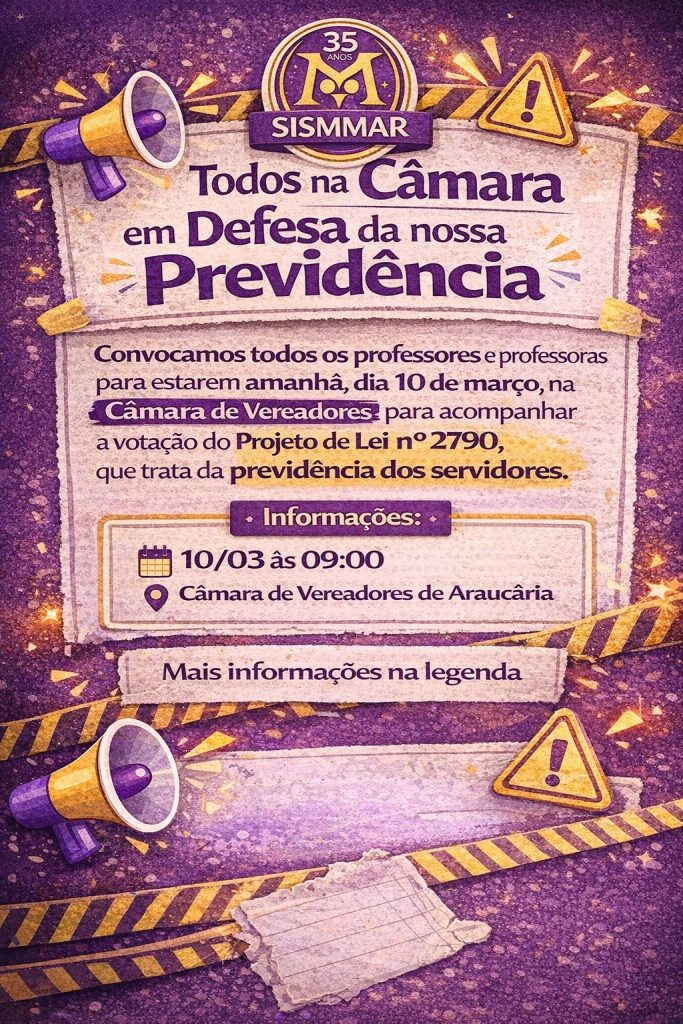 Convocamos todos os professores e professoras para estarem amanhã, dia 10 de março, na Câmara de Vereadores, para acompanhar a votação do Projeto de Lei nº 2790, que trata da previdência dos servidores. 📄✊ Depois de muita mobilização e negociação com o Fundo de Previdência e o Sismmar, o Executivo retirou o artigo 2º (parágrafo […]