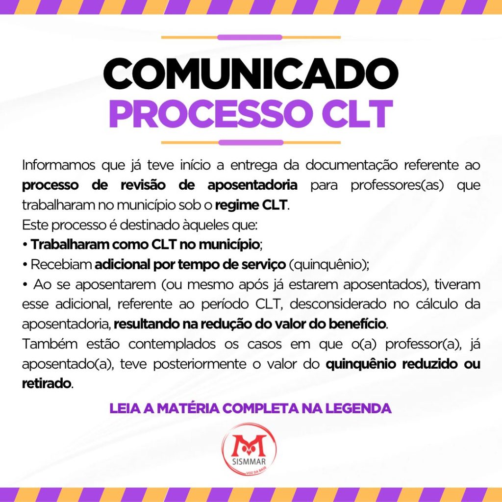 Informamos que já teve início a entrega da documentação referente ao processo de revisão de aposentadoria para professores(as) que trabalharam no município sob o regime CLT. 📄 📌 Este processo é destinado àqueles que: * 👩🏫 Trabalharam como CLT no município * ⏳ Recebiam adicional por tempo de serviço (quinquênio) * 📉 Ao se aposentarem […]