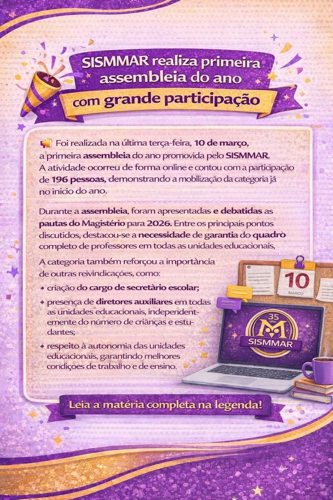 Foi realizada na última terça-feira, 10 de março, a primeira assembleia do ano promovida pelo SISMMAR. A atividade ocorreu de forma online e contou com a participação de 196 pessoas, demonstrando a mobilização da categoria já no início do ano. Durante a assembleia, foram apresentadas e debatidas as pautas do Magistério para 2026. Entre os […]