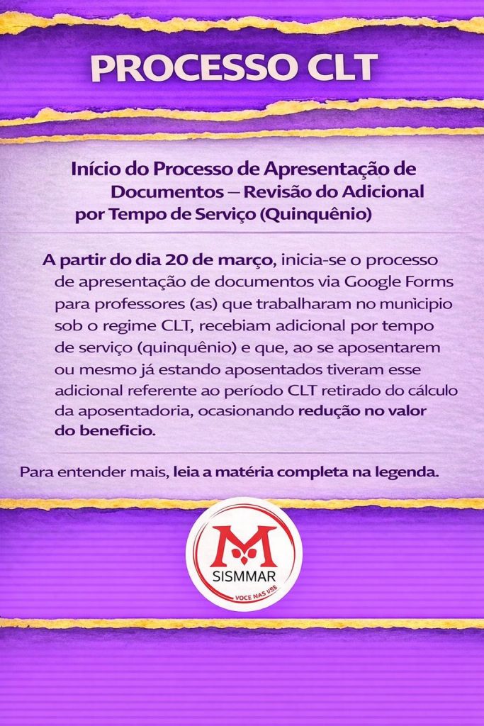 Início do Processo de Apresentação de Documentos – Revisão do Adicional por Tempo de Serviço (Quinquênio) 📅 A partir do dia 20 de março, inicia-se o processo de apresentação de documentos via Google Forms para professores(as) que trabalharam no município sob o regime CLT, recebiam adicional por tempo de serviço (quinquênio) e que, ao se […]