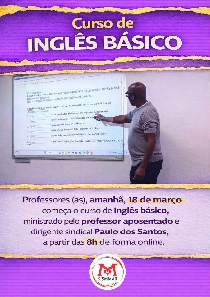 📢 Professores (as), amanhã, 18 de março começa o curso de Inglês básico, ministrado pelo professor aposentado e dirigente sindical Paulo dos Santos, a parti das 8h de forma online