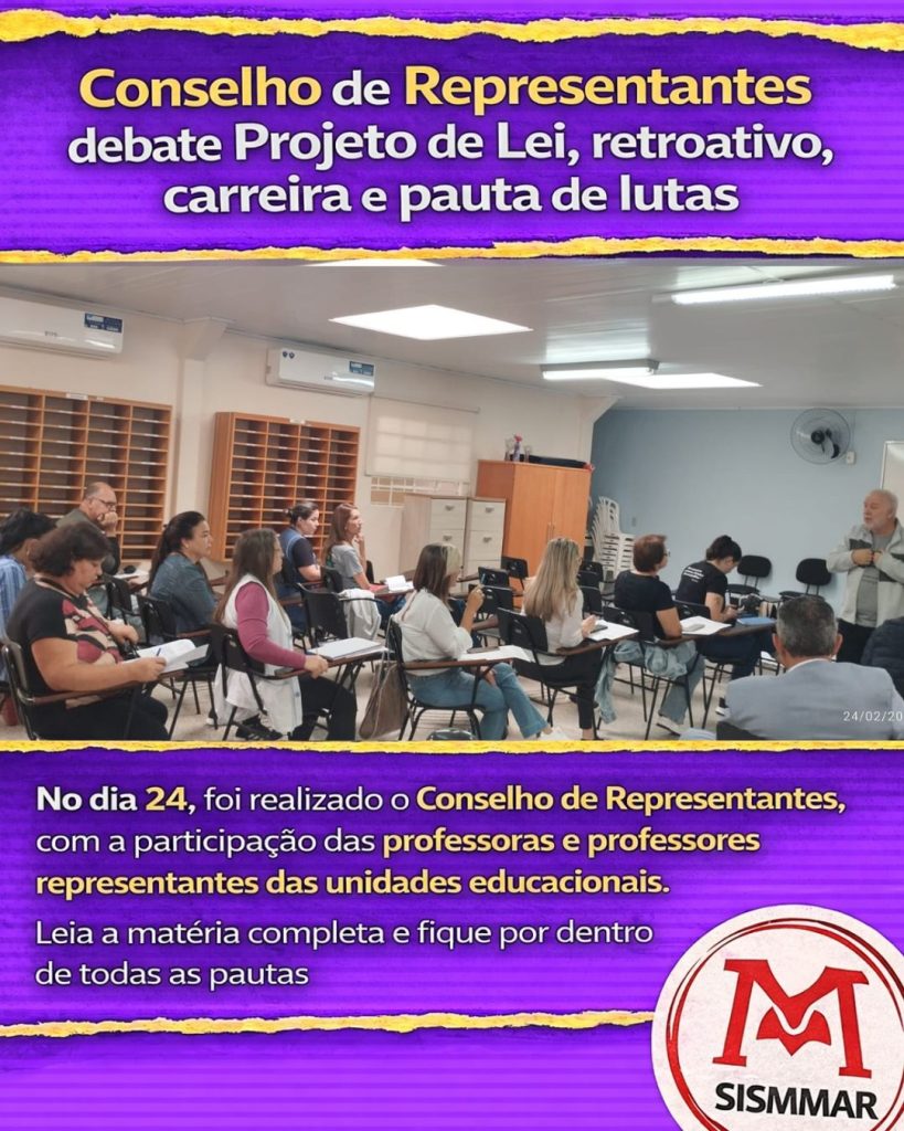 Amanhã acontece o Conselho de Representantes (CR), que será realizado na quarta-feira, 25 de março, em dois horários: às 8h e às 13h, na sede do sindicato. 🏫 📍 Haverá, ainda, um ato de entrega da pauta prioritária do magistério na Prefeitura, às 13h30. 📝 Entre os principais pontos da pauta, destacam-se: * 💰 Pauta […]