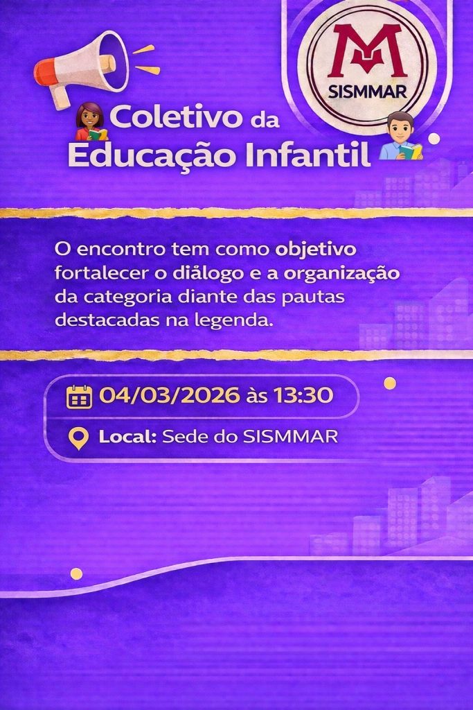 O Sismmar convoca todas as professoras e professores da Educação Infantil para participarem do Coletivo da Educação Infantil, que acontece na quarta-feira, 4/3, às 13:30 🗓️⏰ O encontro tem como objetivo fortalecer o diálogo 🤝 e a organização da categoria diante da seguinte pauta: ● 📚 Concurso público para professoras(es) da Educação Infantil; ● 💰 […]