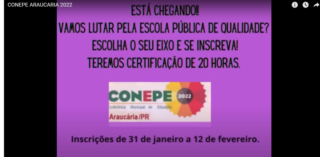A Conferência Estadual Popular de Educação – CONEPE etapa Araucária chega ao seu segundo dia nesta sexta-feira (18). Se você se inscreveu para algum dos seis Eixos disponíveis, não deixe de participar e garantir o seu certificado de 20 horas pela Unespar. Hoje as atividades têm início às 18h30 e os links para que os(as) […]
