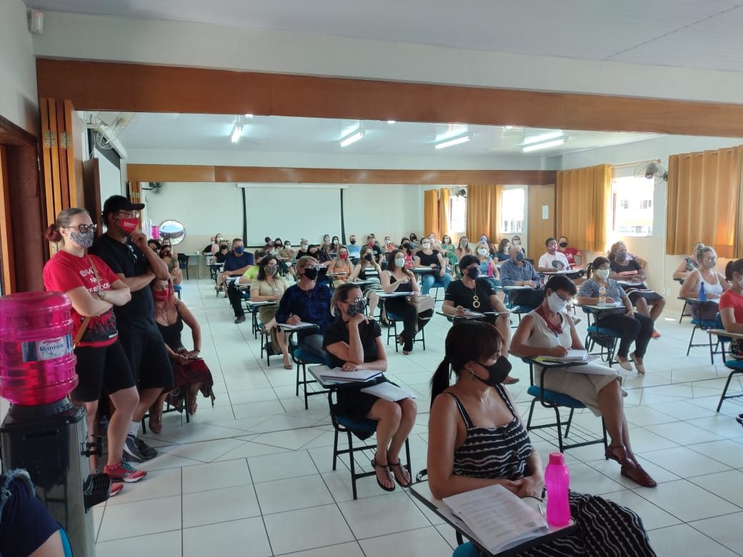 É possível ver, pelas fotos, que não houve respeito algum em relação a essas determinações. Mesmo assim, e com diversos trabalhadores e os sindicatos apontando tais questões já no início da reunião, as representantes da Smed optaram por continuar a reunião e manter as convocações do dia seguinte.
